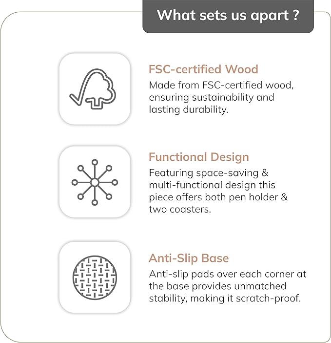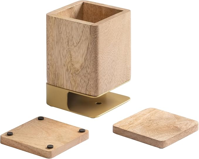 - Elegant Desk Accessories: Crafted from sustainable mango wood, this wooden pen cup and coasters set enhances office desk accessories with its sleek design, offering a refined touch to any office desk environment.