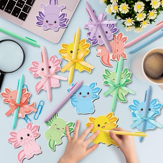 - Package Includes: Our set includes 24 axolotl-themed sticky notes. (4 notepads per color and 30 sheets per pad, totaling 720 sheets.) Additionally, you'll receive 24 colorful ribbons and 24 matching pens, with each color featuring 4 ribbons and 4 pens. This comprehensive combination enhances functionality and adds a stylish touch to your stationery collection.