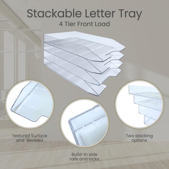 Acrimet Stackable Letter Tray, 4 Tier Front Load Desktop File Organizer, A4 Letter Size, Plastic, Clear Crystal