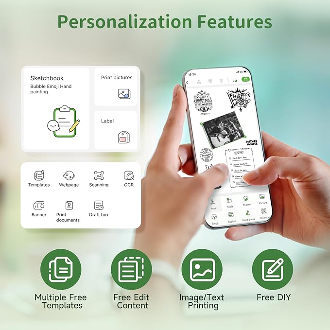 - Smart APP: this portable printer comes with a free APP, which contains many Functions, there are a variety of templates, bubbles, emoticons, etc. for you to customize the use, you can also directly take a picture to print, very simple and convenient