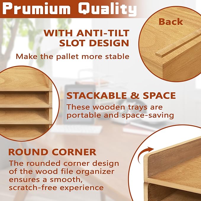 - 【Timeless Wooden Desk Organizer】Keep your desk neat, organized, and visually appealing with our set of 4 wooden paper trays. Whether you're sorting mail, managing documents, or storing files, this elegant organizer offers both functionality and timeless style. Crafted with a warm natural wood finish and clean lines, it's a perfect fit for modern, rustic, or traditional décor.