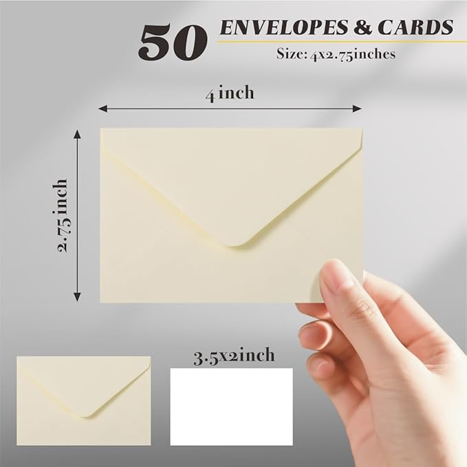 - Perfect Set for All Needs: This set includes 50 cream white mini envelopes (measuring 4 x 2.7 inches) and 50 blank cards, offering a complete solution for your card packaging needs. Compact and lightweight, they are easy to carry and store, making them ideal for gift cards, invitations, name cards, thank you notes, and more. Whether you're planning a party, sending out business cards, or creating handmade crafts, this set has you covered.