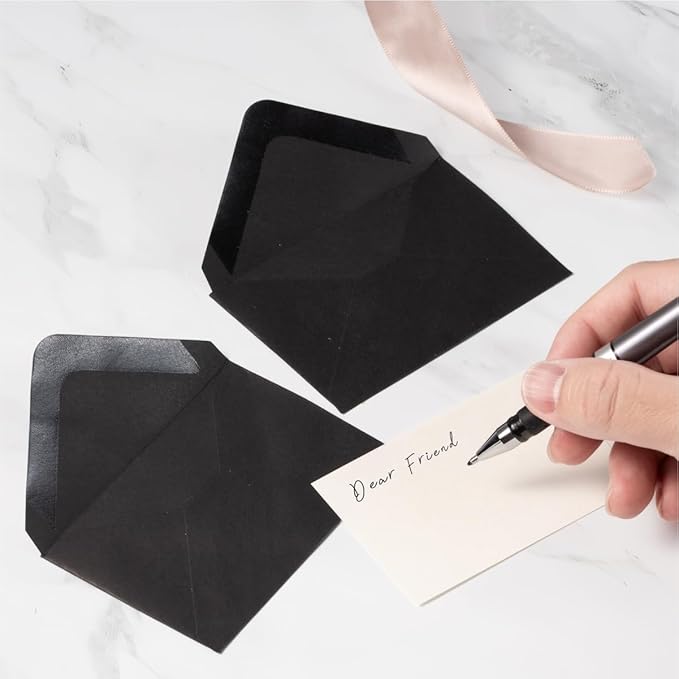 - Perfect Set for All Needs: This set includes 50 black mini envelopes (measuring 4 x 2.7 inches) and 50 blank cards, offering a complete solution for your card packaging needs. Compact and lightweight, they are easy to carry and store, making them ideal for gift cards, invitations, name cards, thank you notes, and more. Whether you're planning a party, sending out business cards, or creating handmade crafts, this set has you covered.