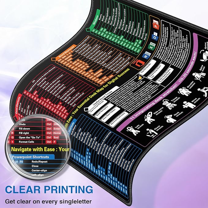 - Useful and Interesting Shortcut Key Patterns: Featuring an Excel/Word/Power Point shortcut mouse pad design, this cheat sheet desk mat is perfect for anyone who frequently uses computer. Keep essential shortcuts and formulas at your fingertips, saving time and boosting productivity