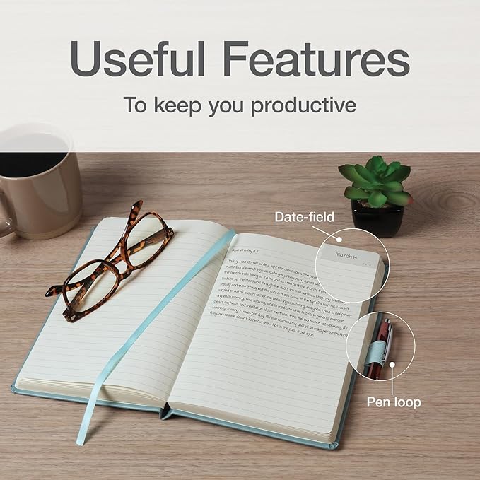 - On the first page of each writer's journal, there's a space for your name, contact info and address; sturdy hardcovers are pale teal for a calm, simple look at home or in the office