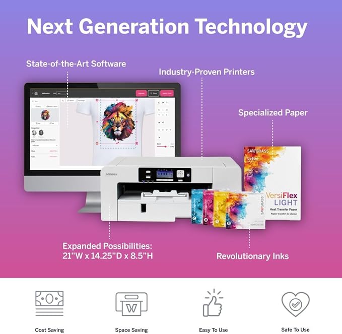 Sawgrass SG1000 VersiFlex Printer Bundle, Innovative Inks & Light Heat Transfer Paper Bundle - Soft-Touch Infusible Ink, 8.5x11 Paper - Professional Results on Untreated Fabric and Wood