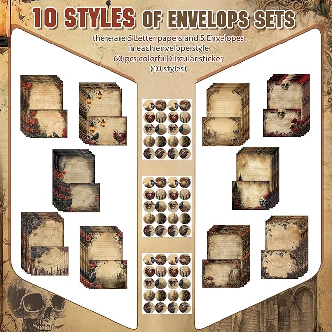 - Gothic Paper Stationery Set: you will receive 50 stationery paper and envelopes letter sets, including 50 pieces of letter writing papers, 50 matching envelopes with 60 dot stickers; The sufficient quantity and rich designs cover your writing and sending needs
