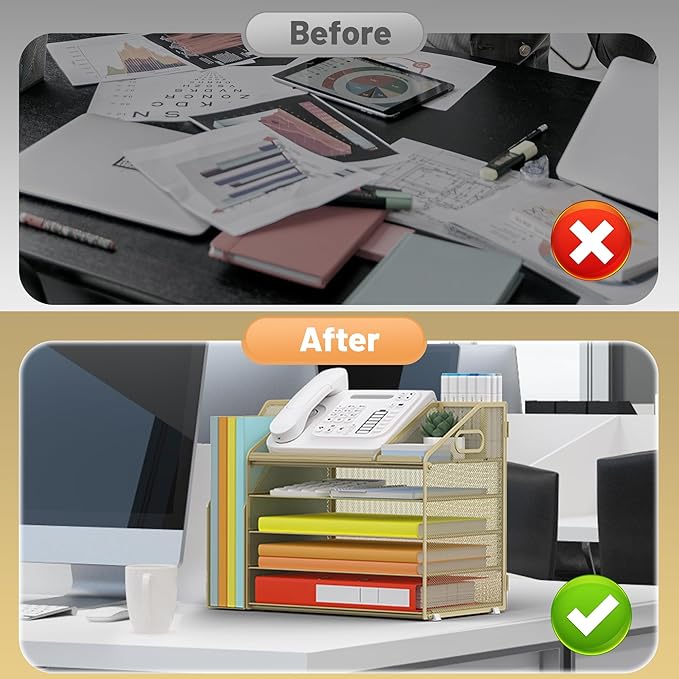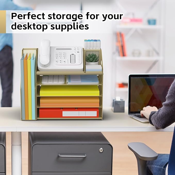 - 5 Tier Organization with Pen Holder: This Gold Yellow desk organizer boasts a 5-tier design for efficient sorting of your papers, letters, and other office supplies, along with a dedicated pen holder. It's perfect for maintaining a tidy and uncluttered workspace. The desk file organizer is an essential desk accessory that contributes to an orderly and professional atmosphere