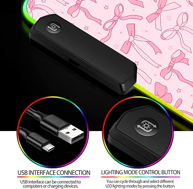 RGB Pretty Bow Girly Gaming Desk Mat, Computer Keyboard Large Extended Long LED Mouse Pad for Office and Home, XL (W24)