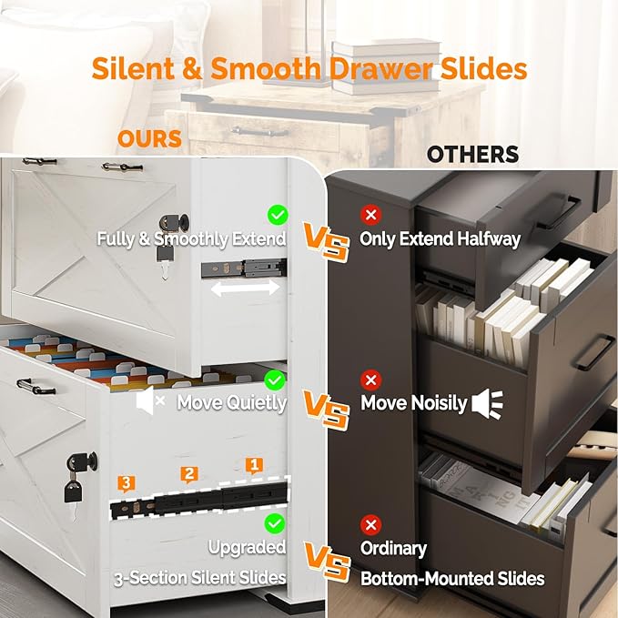 - 【Silent Sliding Perfection】The three-section slides ensure the drawers extend fully and smoothly, without a hint of noise, making it convenient for you to search for and access your file folders.