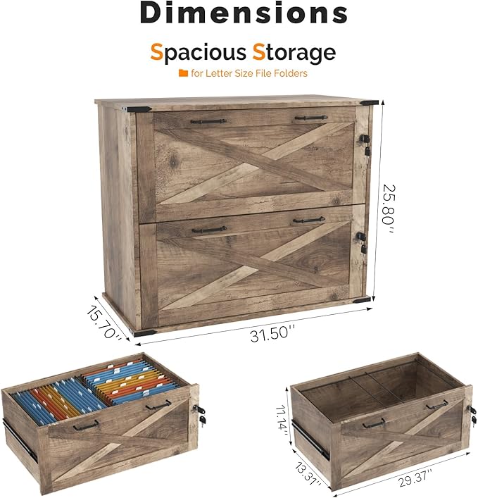 - 【Charming Farmhouse Style】This file cabinet, with its barn door elements and ingenious appearance design, showcases unique charm and stands out, adding farmhouse charm to your home while also being able to enliven any office, study or living room.