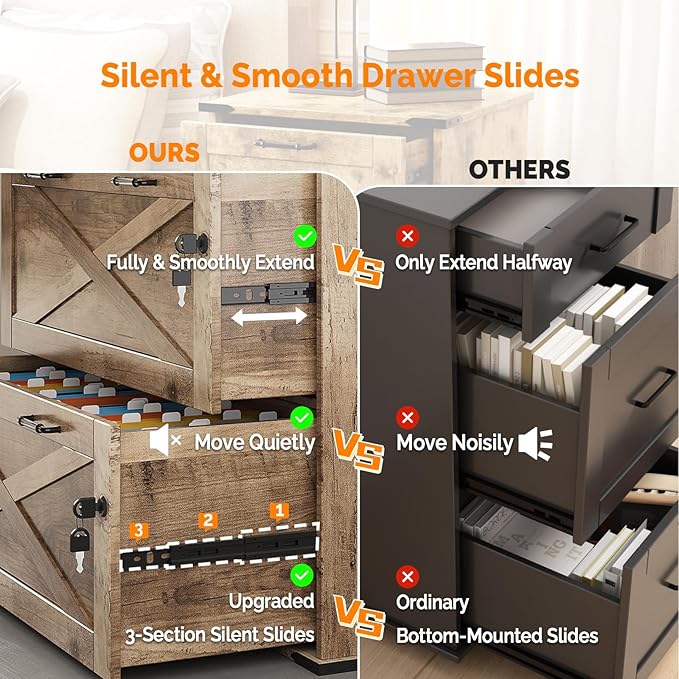 - 【Silent Sliding Perfection】The three-section slides ensure the drawers extend fully and smoothly, without a hint of noise, making it convenient for you to search for and access your file folders.