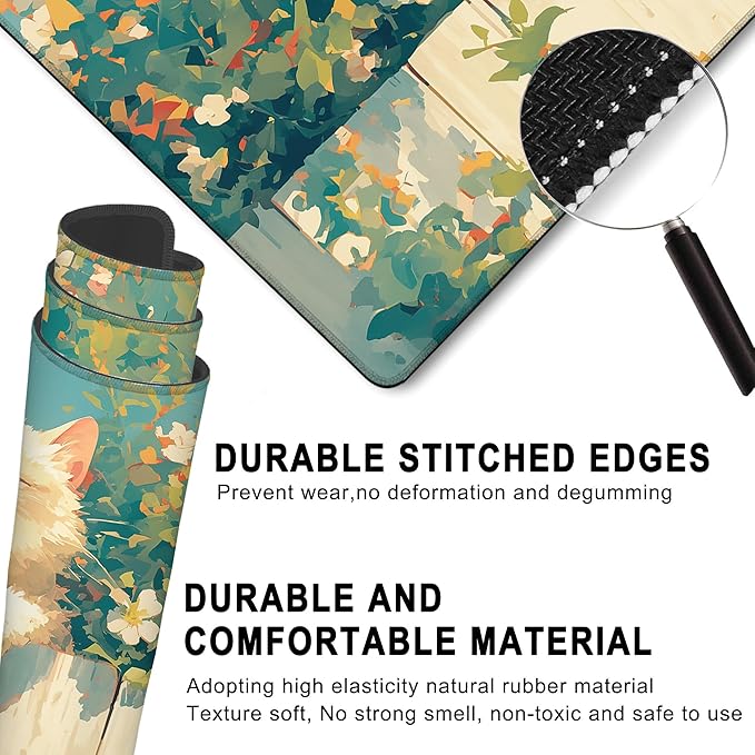 Gaming Mouse Pad, Cute Happy Cat with Flower Large Desk Mat for Keyboard and Mouse,Non-Slip Rubber Base and Stitched Edges Desk Pad for Home Office 35.4x15.7in