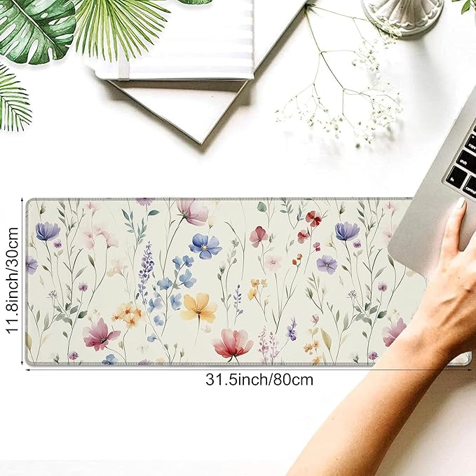 Desk Pad, Watercolor Floral Flowers Leaves XL Gaming Mouse Pad with Stitched Edges,Non-Slip Waterproof Rubber Base Large Desk Mat for Keyboard and Mouse 31.5"x11.8"