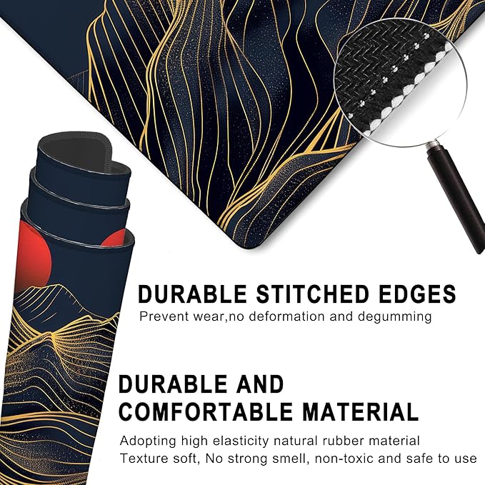 Gaming Mouse Pad, Abstract Golden Mountains and Red Sun Large Desk Mat for Keyboard and Mouse,Non-Slip Rubber Base and Stitched Edges Desk Pad for Home Office 35.4x15.7in
