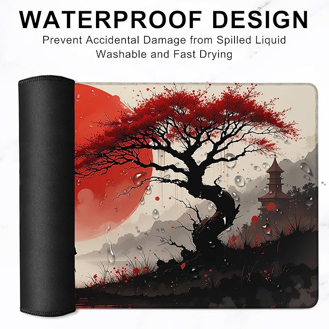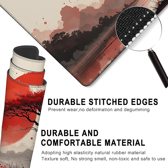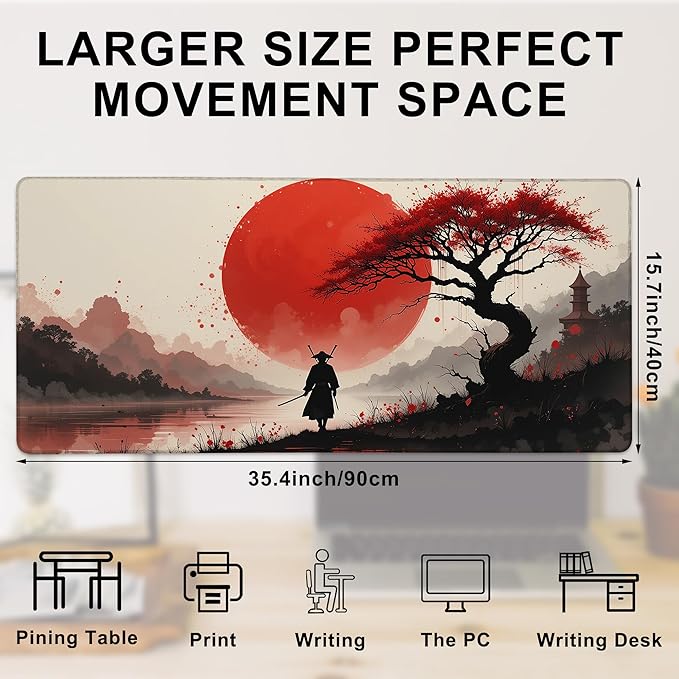 Gaming Mouse Pad, Japanese Cherry Blossom Samurai Large Desk Mat for Keyboard and Mouse,Non-Slip Rubber Base and Stitched Edges Desk Pad for Home Office 35.4x15.7in