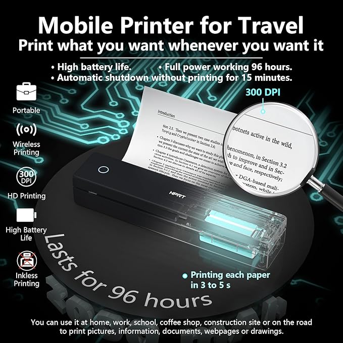 - 【Cost-Effective Inkless Printing】Advanced thermal printing technology, 300dpi HD printing, printing each page in 3-5 s. No need for ink, toner or cartridge. No ink blocking and cleaning troubles. All you need is thermal paper. You can save hundreds of dollars per year compared to using cartridge and paper combination. (Only supports thermal paper, not ordinary copy paper!)