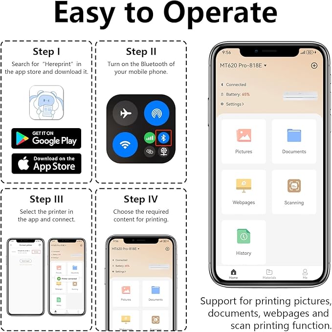 - 【Phone &PC Printing】Supports connected to phones, tablets, computers and laptops. Phones and tablets can print wirelessly via Bluetooth, compatible with IOS Android. PC must be connected via USB cable, compatible with macOS Windows. The first installation can be completed within 5 mins. (For details, see this page "Product Description" or the user manual in the product package.)