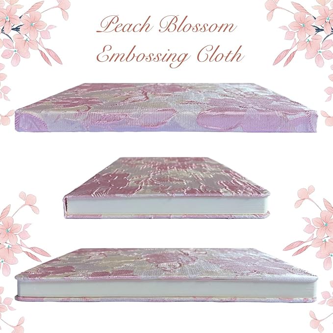 - Chic Fabric Cloth Cover: this floral notebook adorned with a luxurious fabric cloth cover featuring an enchanting pink peach blossom, this textile printing design exudes femininity and grace.