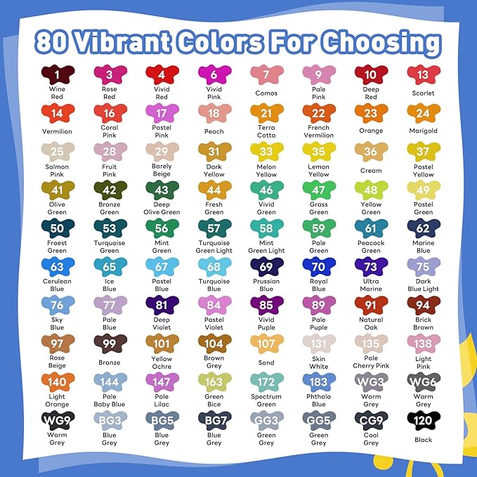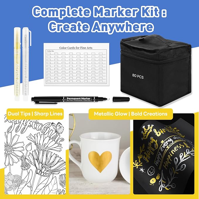 - 80+4 Alcohol Markers: This alcohol marker set includes 80 vibrant colors, along with 4 additional items: 1*color chart, 1 *gold metallic marker, 1*silver metallic marker, and 1*dual liner pen. These bonus accessories provide more options and enhance the versatility of your creative projects