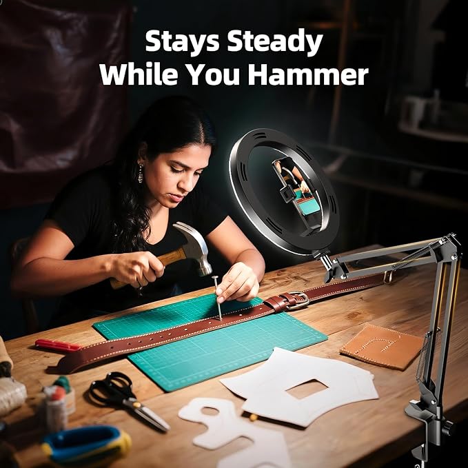- 【Space-saving desk clamp design】Ditch the bulky tripod. This ring light with stand includes a clamp that attaches directly to your desk, shelf, or table—making it the perfect ring light for desk setups. The padded grip fits surfaces up to 2.2" thick and protects your furniture while keeping the entire overhead phone mount with ring light stable. Ideal for creators working in compact spaces or anyone looking to maximize workspace without sacrificing functionality.
