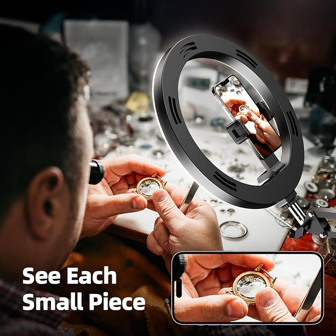 - 【Bright, steady light for every detail】Working under poor lighting can strain your eyes, distort colors, and reduce productivity—especially when working on delicate, detailed tasks. That’s why the LUXSURE ring light with stand delivers a powerful yet eye-friendly 18W glow. This ring light for desk setups gradually fades on when powered, providing soft and even illumination across your entire workbench. Whether you're sewing, building models, or filming how-to videos using a ring light tripod for iPhone, the consistent lighting helps you see every detail clearly—without glare or eye fatigue.