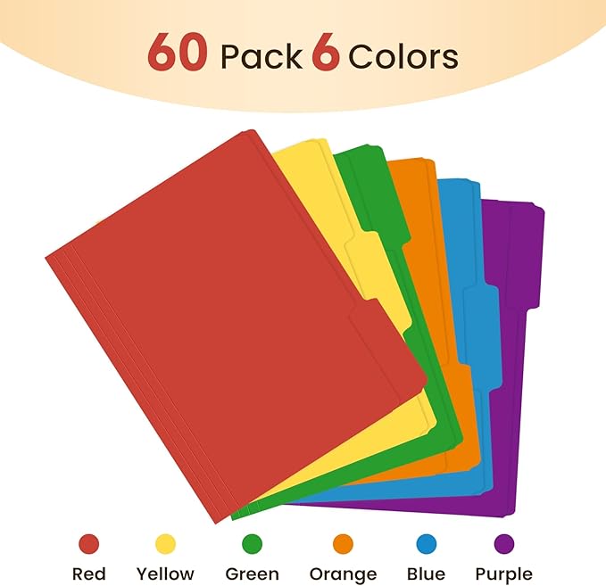 - 60 Pack Letter-Size File Folders: Includes 60 paper file folders (8.5" x 11") designed for efficient organization of standard letter-size documents. Ideal for home, office, or classroom use.