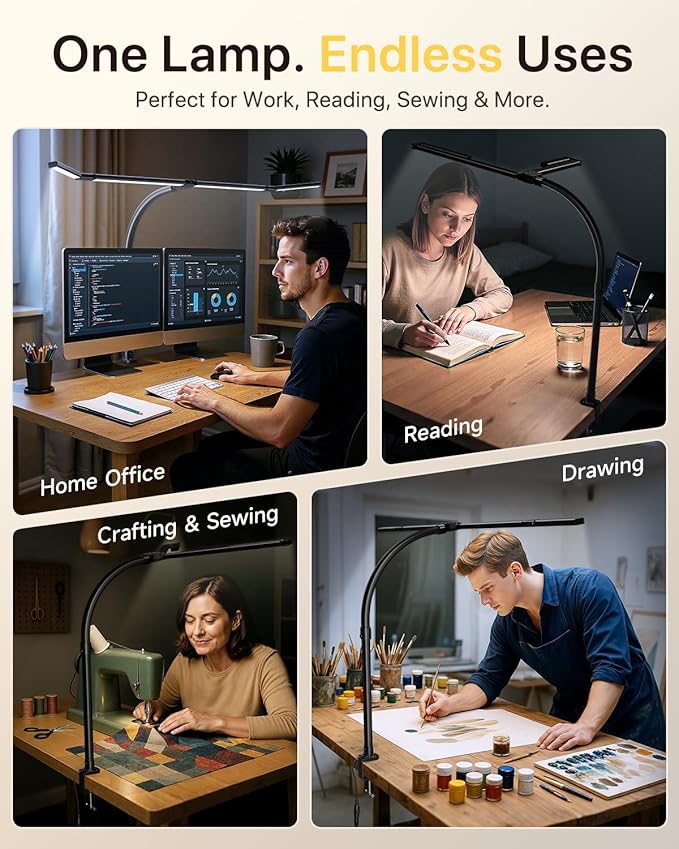 - Ultra-Wide & Super-Bright Light Bar: This 42-inch LED desk lamp features a 4-segment architect-style light bar with independently rotatable panels. Fold the segments inward for focused, task-oriented lighting—or swivel them outward to blanket up to 80 inches of workspace in wide, even illumination. With 1800 lumens of flicker-free brightness, it’s ideal for dual monitors, puzzle tables, sewing setups, and creative workspaces in home offices or dorms.