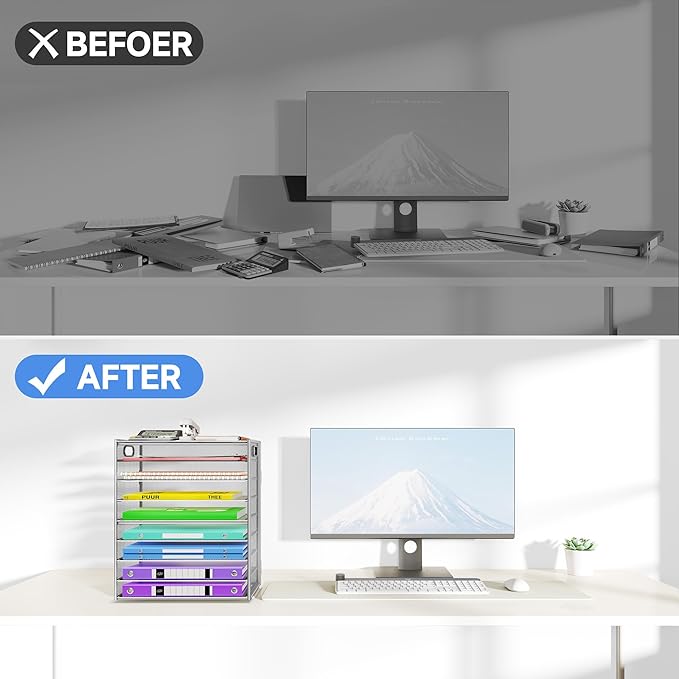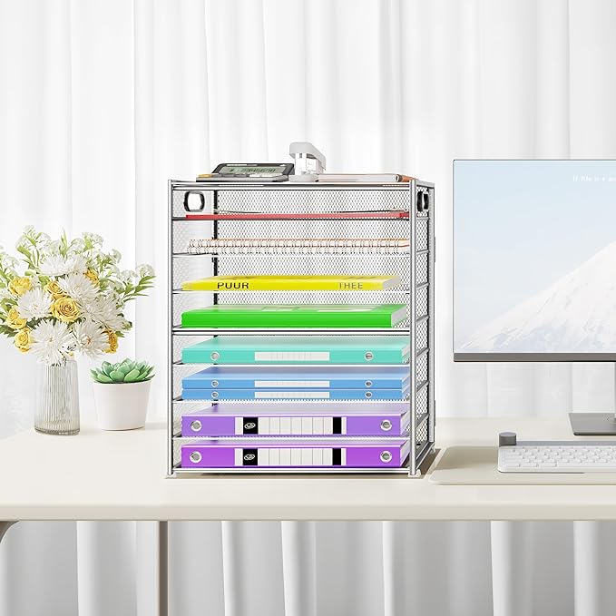 - 【EXTRA-LARGE STORAGE CAPACITY】Our 9-tier paper organizer offers more storage space than low-capacity file organizers, allowing you to sort and store more papers, letters, documents, folders, books, magazines, staplers, calculators, and sticky notes. Keep your workspace tidy and organized!