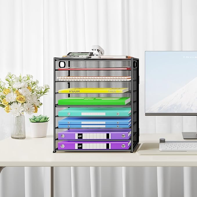 - 【EXTRA-LARGE STORAGE CAPACITY】Our 9-tier paper organizer offers more storage space than low-capacity file organizers, allowing you to sort and store more papers, letters, documents, folders, books, magazines, staplers, calculators, and sticky notes. Keep your workspace tidy and organized!