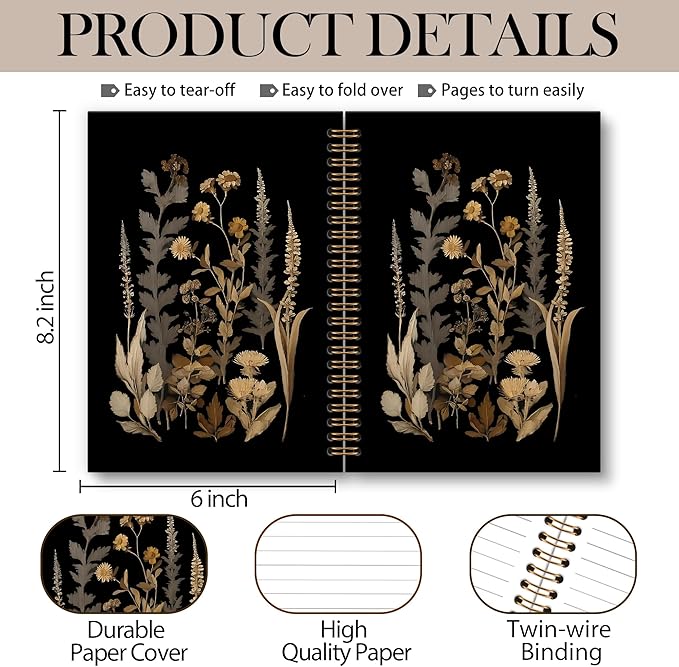Dark Botanical Notebook Journal - Black Moody Notebook, Vintage Botanical Cottagecore Spiral Notebooks, Vintage Notebooks Gifts for Women, Dark Academia School Office Supplies, 6x8.2In