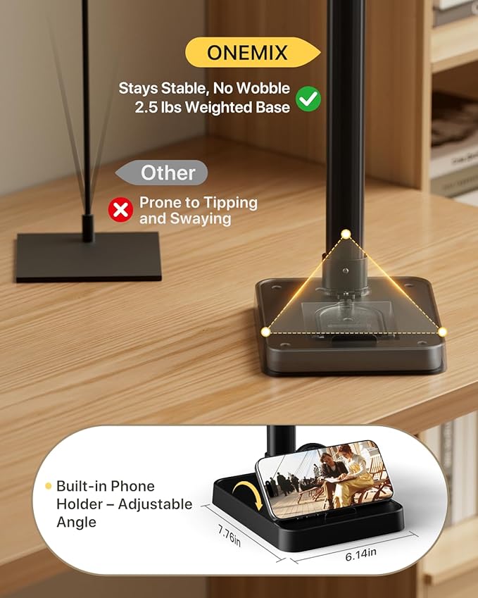 - Adjustable Arm & Sturdy Weighted Base: The 27.7-inch support arm is made of high-quality ABS plastic, with the upper gooseneck section allowing smooth 180° front-and-back bending for precise positioning. The aluminum alloy base features a 2.5 lb weighted insert for rock-solid stability with no wobble or tipping. It also includes a built-in phone holder for hands-free viewing—perfect for desks, countertops, or creative workspaces.