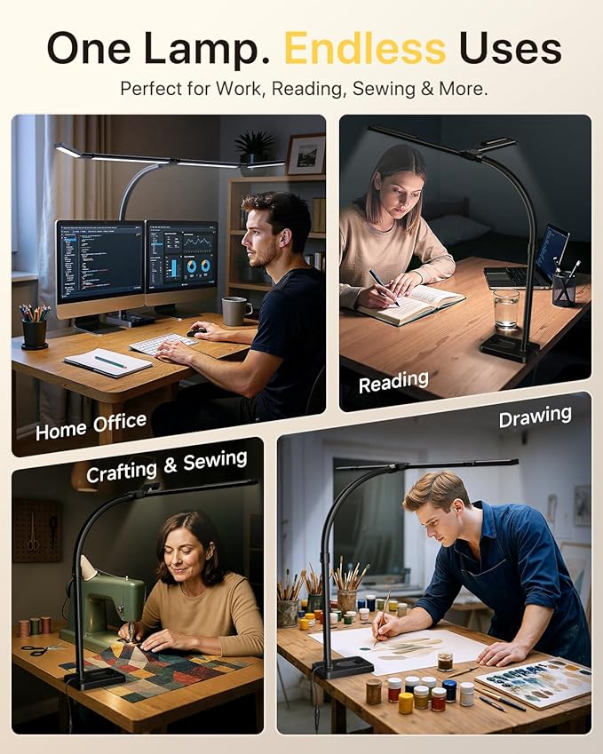 - Ultra-Wide & Super-Bright Light Bar: This 42-inch LED desk lamp features a 4-segment architect-style light bar with independently rotatable panels. Fold the segments inward for focused, task-oriented lighting—or swivel them outward to blanket up to 80 inches of workspace in wide, even illumination. With 1800 lumens of flicker-free brightness, it’s ideal for dual monitors, puzzle tables, sewing setups, and creative workspaces in home offices or dorms.