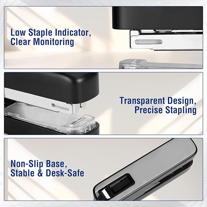 - Low Staple Indicator & Anti-Slip Base: Designed for reliable stapling, the stapler comes with spring-loaded base that guarantees effortless stapling with minimal effort; The low staple indicator allows to add staples in time and the anti-slip base provides stability for every stapling job