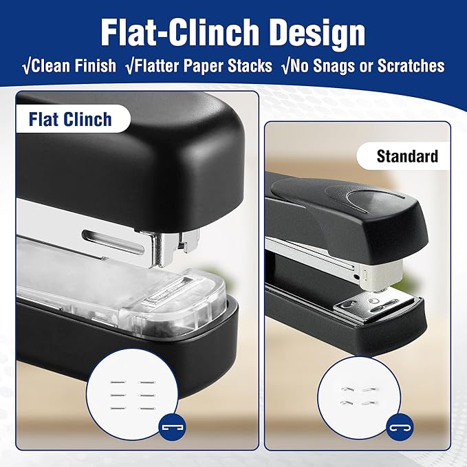 - Flat Clinch Stapling: The desktop stapler features a flat-clinch design, creating flatter, more compact stacks of paper that stay neat and organized, which also helps prevent scratches, ensuring smooth and jam-free stapling every time