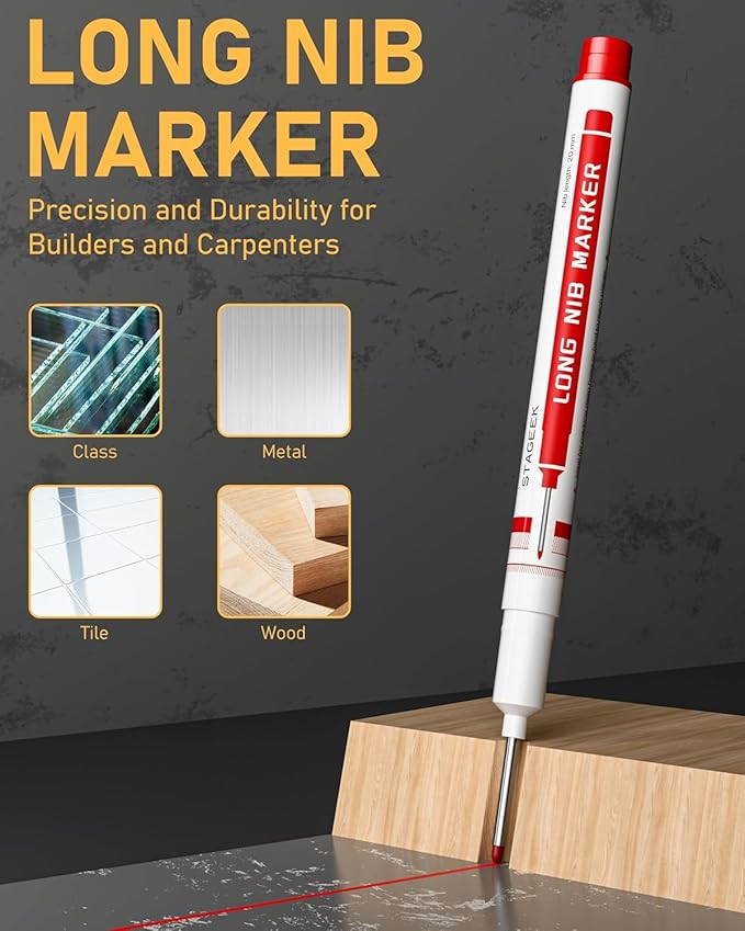 - Deep Hole Marker Pens: These long-tip, waterproof Marker Pens are perfect for marking on hard-to-reach surfaces such as glass, metal, and plastic—where traditional woodworking pencils may not suffice. The set's versatility is enhanced by these deep hole markers, offering precise marking across a variety of materials