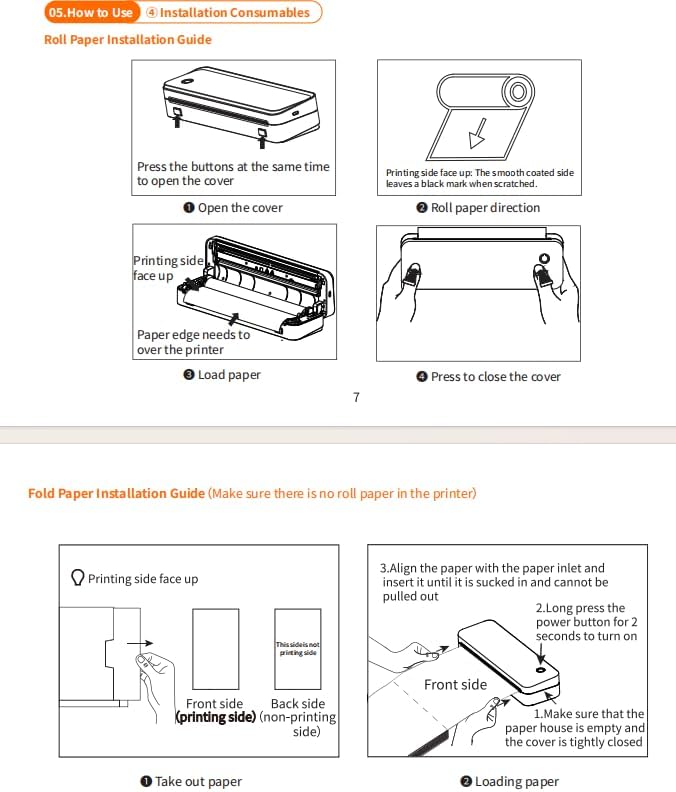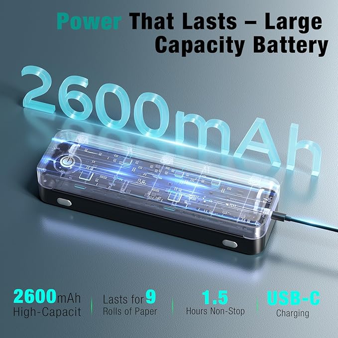 - 【High-Quality Output】This thermal printer delivers clear images, dark prints, and smooth printing results with fast processing speed. The wireless, inkless printer offers about 1.5 hours of continuous printing on a full charge. NOTE: The printer does not restrict the brand of thermal roll paper; all thermal roll papers are compatible. However, thermal sheets letter papers from different brands may not necessarily be compatible with each other. It is recommended to use thermal roll paper.