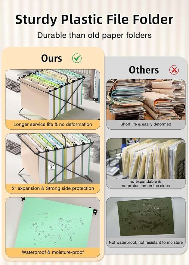 - 【PLASTIC HANGING FILE FOLDER】: The heavy duty hanging file folder is made of PP plastic, sturdy & tear resistant, not easily dirty, and has a longer usage time compared to paper materials
