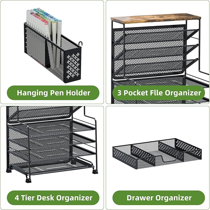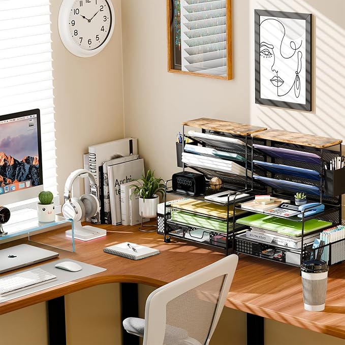 - 【Premium Materials】 The top shelf of the office desk organizer is made of sturdy wood, while the trays are crafted from lightweight, durable metal mesh, ensuring reliable performance. When in use, the smooth grooves allow the trays to be easily pulled out and pushed back in.