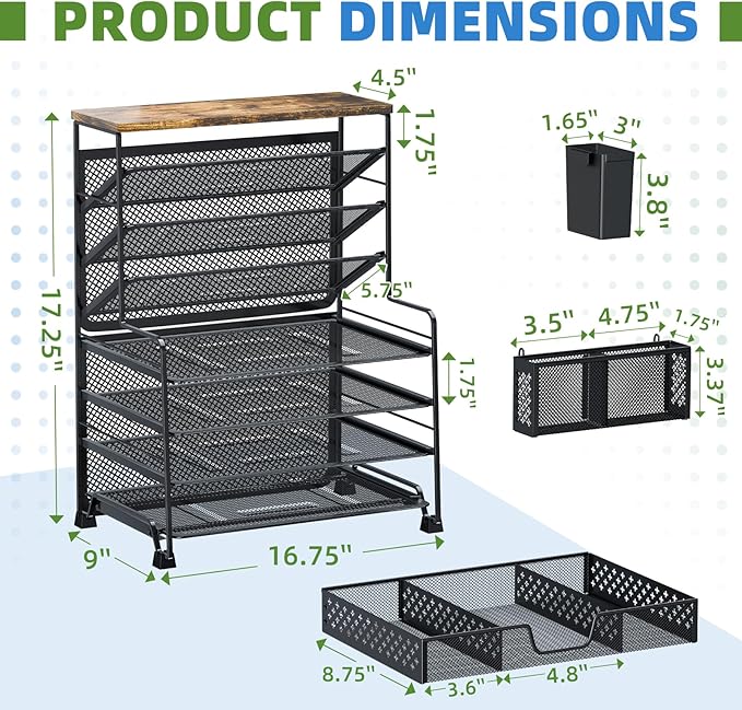 - 【8-Tier Large Capicity】Measures 16.75"L x 9"W x 17.25"H in total, 1.75 inches for each tray. The desktop paper tray organizer is big enough to hold more various letters, papers, books, bills, and more. The desktop organizer makes it easy to quickly identify the contents of each compartment!