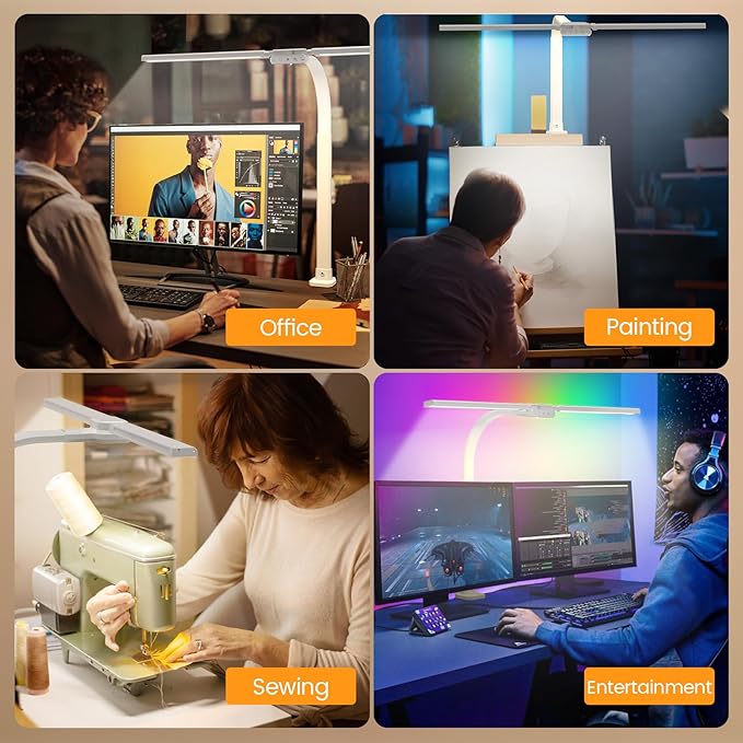 - 【Multi-Mode & Upgraded RGB Color】 This rgb desk light has 5 white/warm color temperatures (3000K-6500K) x 5 levels of brightness (10%-100%) x 7 RGB modes (single & dynamic), various light combination modes can be realized. It also has night, reading, working, gaming, relaxing mode to meet your various lighting needs.