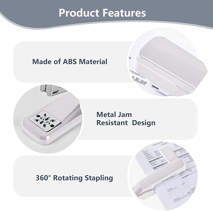 - 360° Full Rotation & 8-Position Lock : This swing-arm stapler features a smooth 360-degree rotation and 8 adjustable locking angles, allowing flexible stapling from any direction—perfect for booklets, reports, or thick stacks. Boost efficiency with one-handed operation and ergonomic design