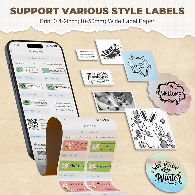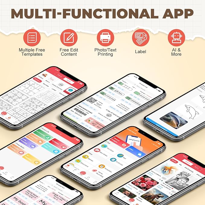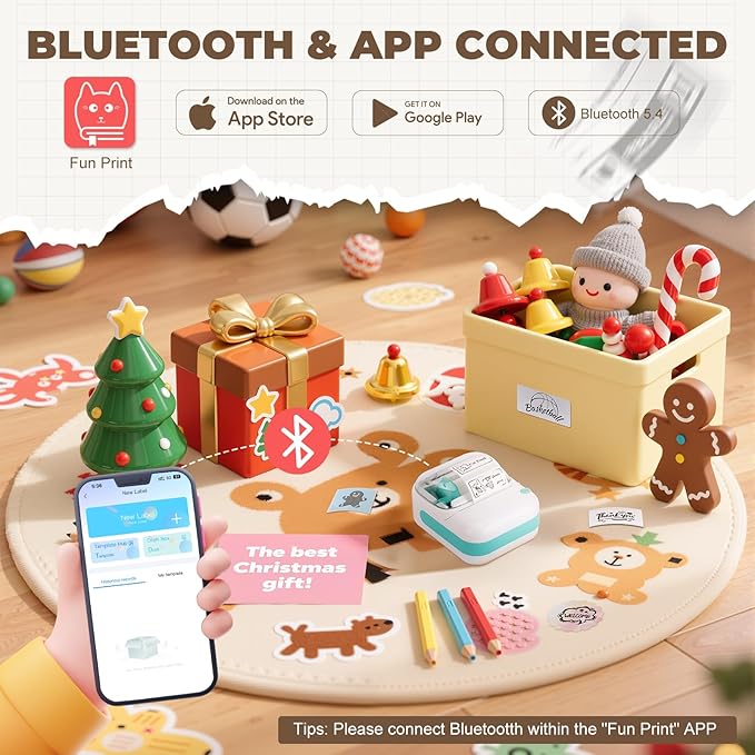 - Powerful APP: Compatible with iOS and Android systems, the printing application "Fun Print" of this mini sticker printer can be easily downloaded to your mobile phone from App Store and Google Play Store, explore various templates through the APP, it can print barcodes, QR codes, images, photos, documents and labels to meet most of your needs