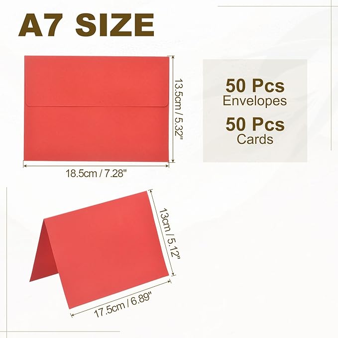 - Envelope Material: 120gsm paper; Card Material: 250gsm cardstock; Color: Red; Envelope Size: 18.5 x 13.5cm / 7.28 x 5.32inch(L*W); Card Size: 35 x 13cm / 13.78 x 5.12inch(L*W); Folded Card Size: 17.5 x 13cm / 6.89 x 5.12inch(L*W); Packing List: 50pcs of envelopes, 50pcs of cards