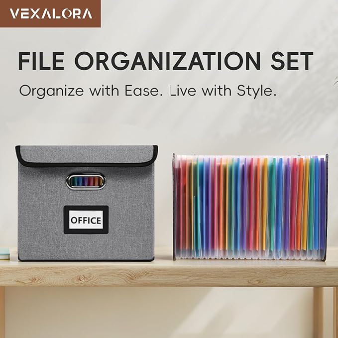 - 【Revolutionary "file box + accordion folder + 25 pockets" 2-in-1 Design】 Traditional storage boxes lack sorting functionality, while hanging file folders prevent lid closure, Vexalora perfectly solves this pain point, the 25-pocket accordion file folder nests perfectly inside the storage box, achieving precise categorization + smooth lid closure in one integrated solution.