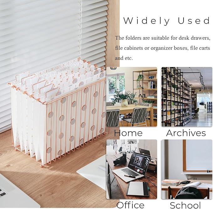 - Space Saving - Our rose gold metal kit is designed for Letter-size hanging file folders, helping to save desktop space. The I-shaped rods minimize visual obstruction, offering a clearer view and allowing for quick folder retrieval