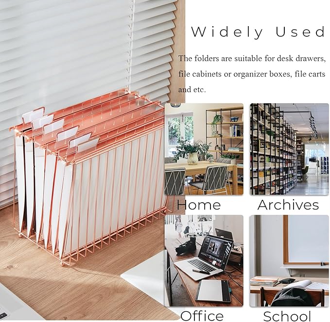 - Space Saving - Our rose gold metal kit is designed for Letter-size hanging file folders, helping to save desktop space. The I-shaped rods minimize visual obstruction, offering a clearer view and allowing for quick folder retrieval