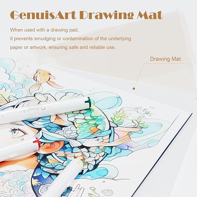 - BLEEDING PREVENT DRAWING MAT: Our GeniusArt Markers Set includes a high-quality silicone drawing mat designed for both protection and performance. Simply place this non-slip, ink-resistant mat beneath your paper before drawing to: Shield Your Desk – The thick, durable silicone creates a reliable barrier against accidental ink stains, keeping your workspace pristine. Prevent Ink Bleeding – Specially designed to absorb excess ink, it minimizes bleed-through so your artwork stays crisp and clean.