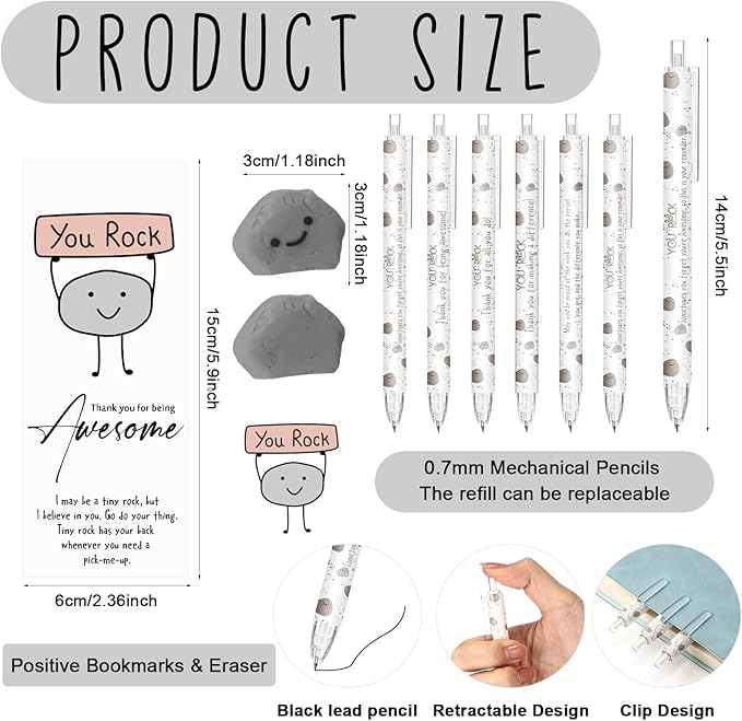 - Motivational Gift Set: you will receive 30 pcs 0.7 mm rock mechanical pencils, 6 styles, 5 each, 30 pcs rock erasers and 30 pcs rock motivational bookmarks; Cute and fashionable, bringing endless fun to your study or office