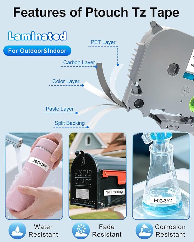 - (3) Tze-231 Tape Laminated : TZ-231/TZe-231 TZ tape 12mm 0.47 laminated white is long lasting and resist to water, oil, abrasion, temperature and fade. Enduring, practical and printed clearly.